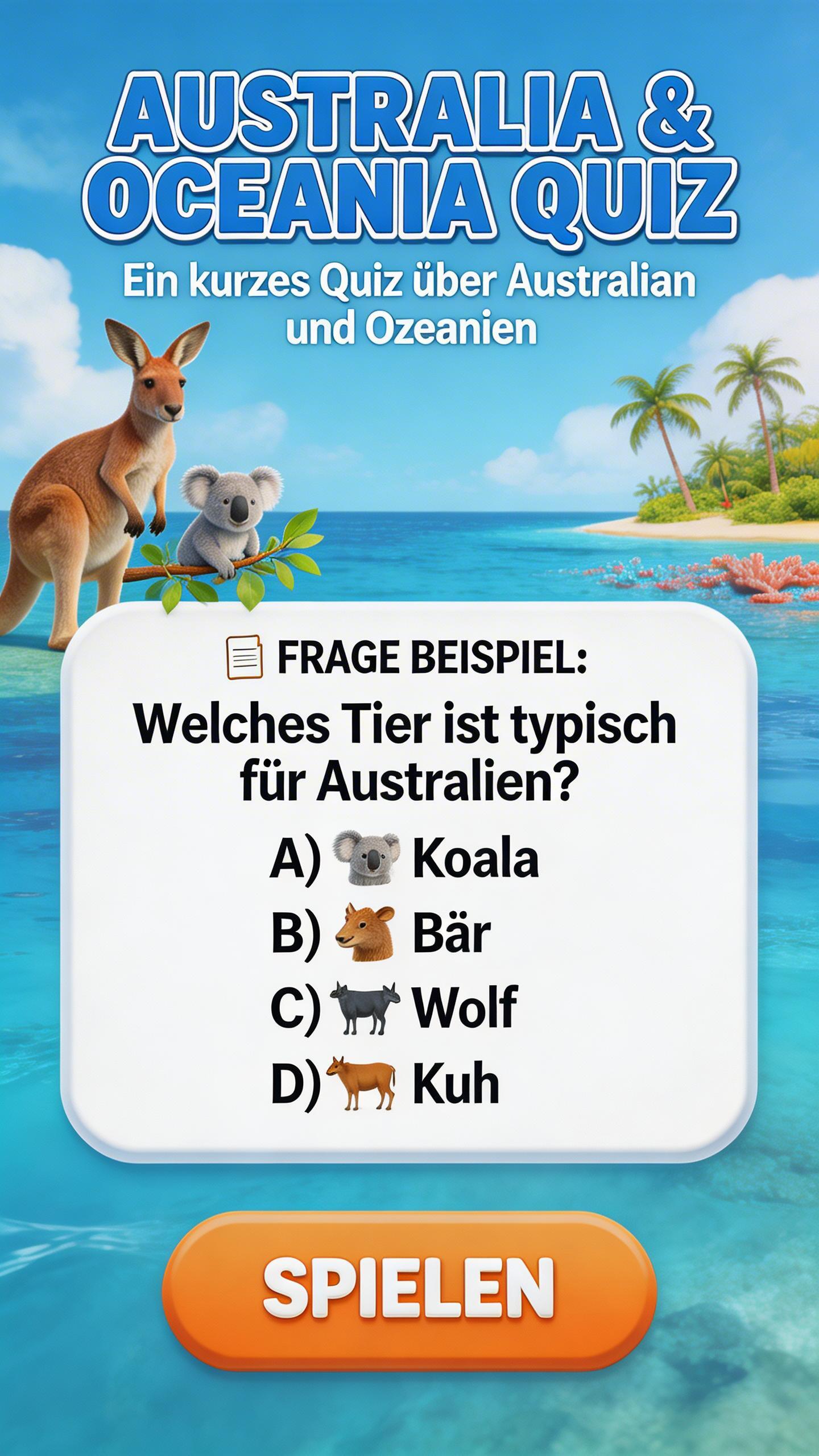 Ein kurzes Quiz über Australien und Ozeanien mit Multiple-Choice-Fragen, einem Timer, vier Antwort-Buttons und einer Fortschrittsanzeige.