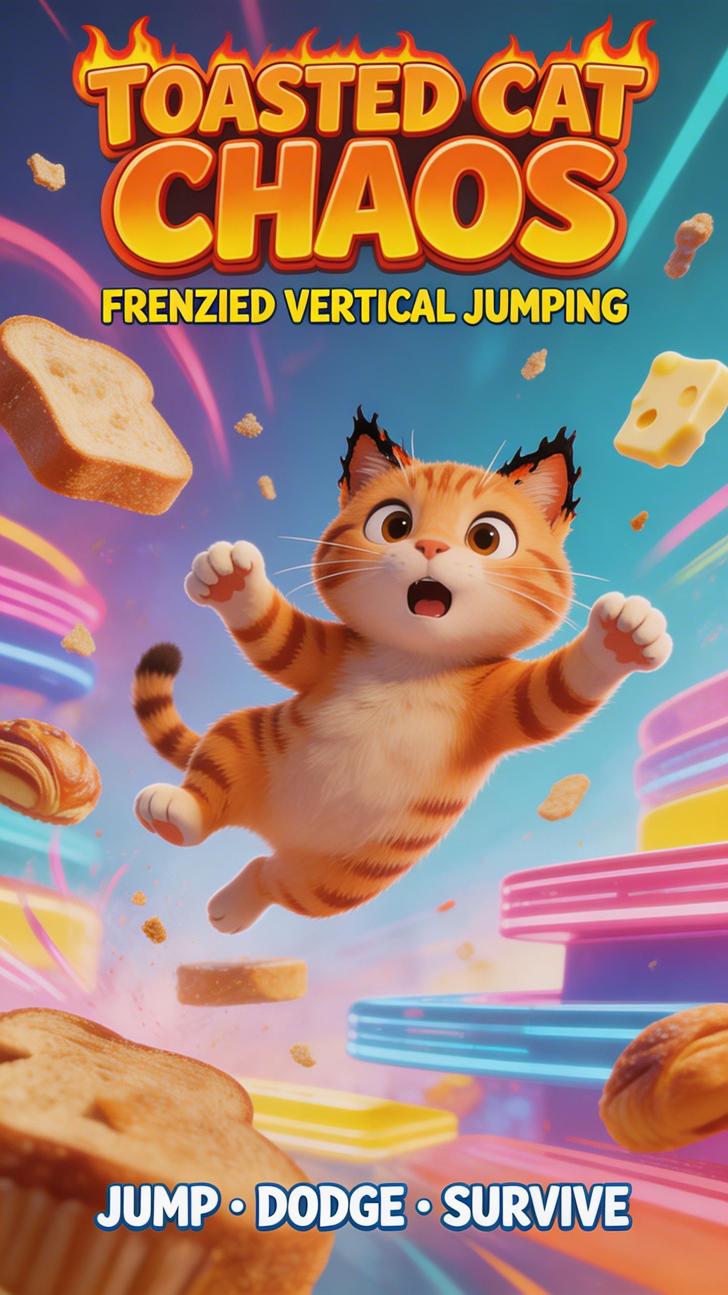 Toasted Cat Chaos is a frantic vertical jumping game where a confused orange cat bounds between chaotic moving platforms.