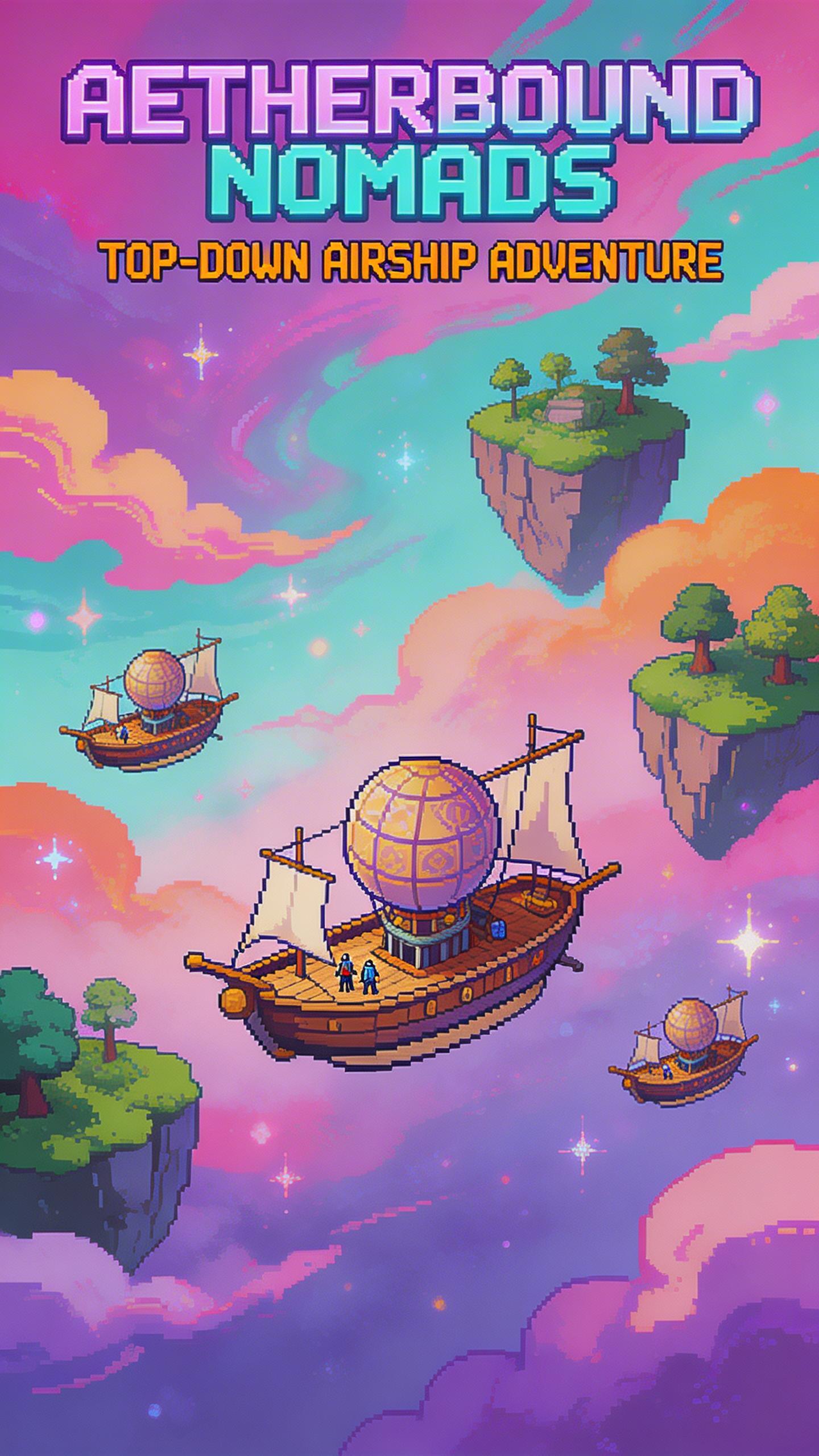 Aetherbound Nomads is a top-down pixel airship adventure about flying through a shattered sky and gathering aether shards. Steer a little airplane past floating islands, sparkling shards ✨, and drifting clouds ☁️.