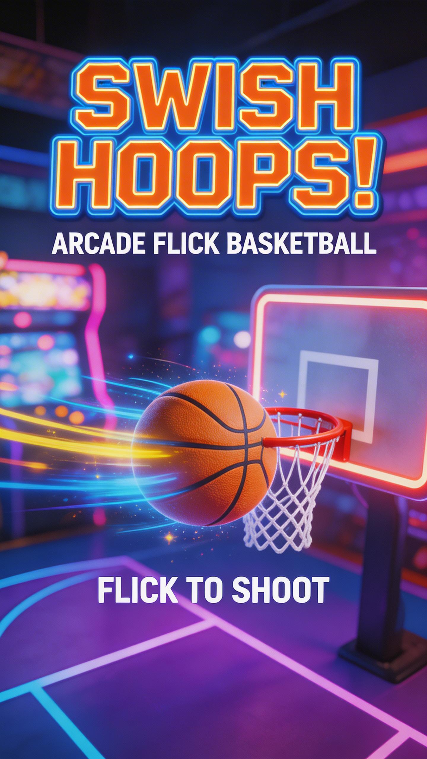 Swish Hoops! is a 3D basketball flick game where you launch arcade-style shots toward a hoop inside a stylized arena.