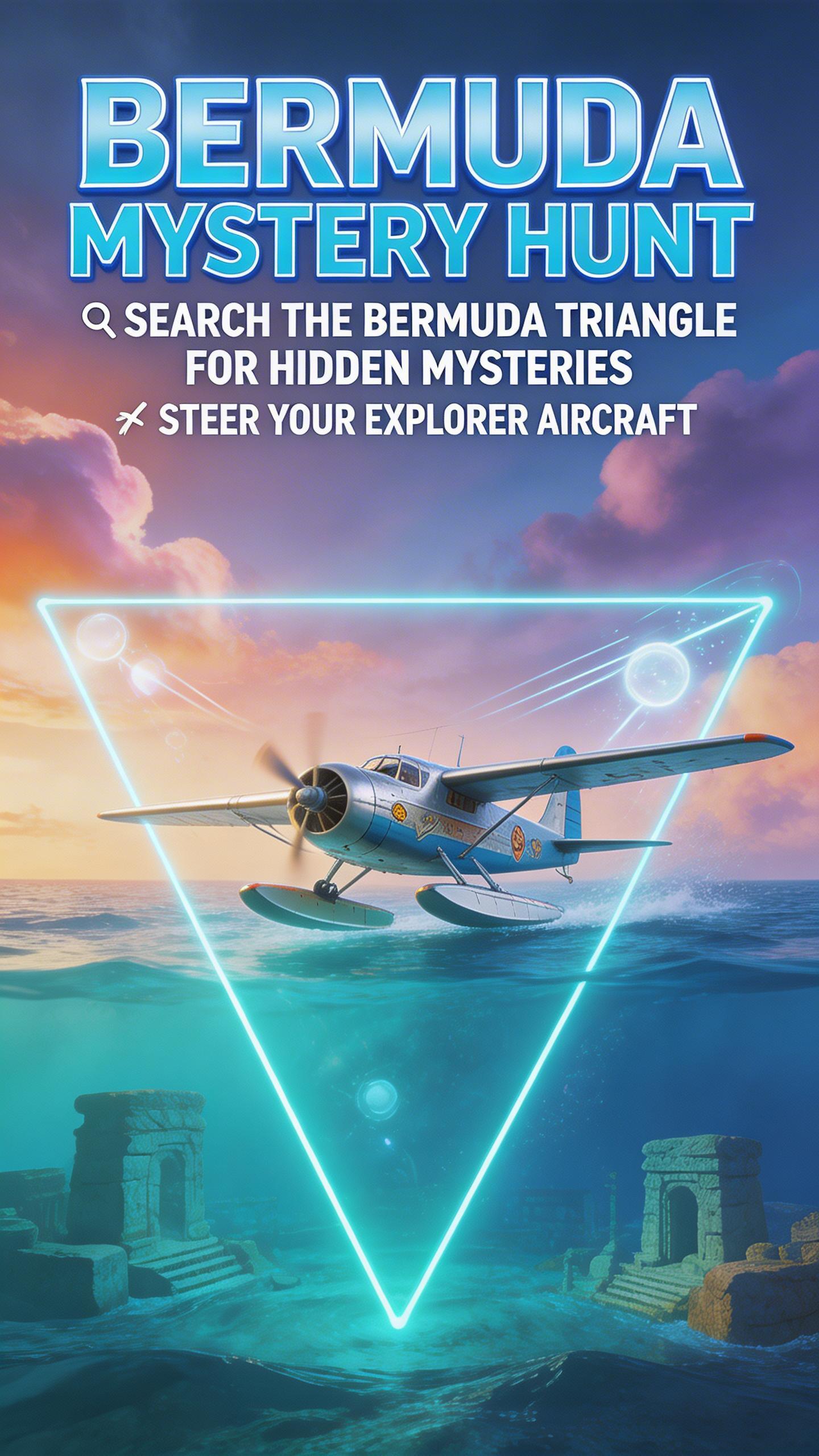 Search the Bermuda Triangle for hidden mysteries while steering your explorer across the sea. Collect three different clue items and keep moving as new finds appear around you, with a small ✦ hint marker on the HUD.