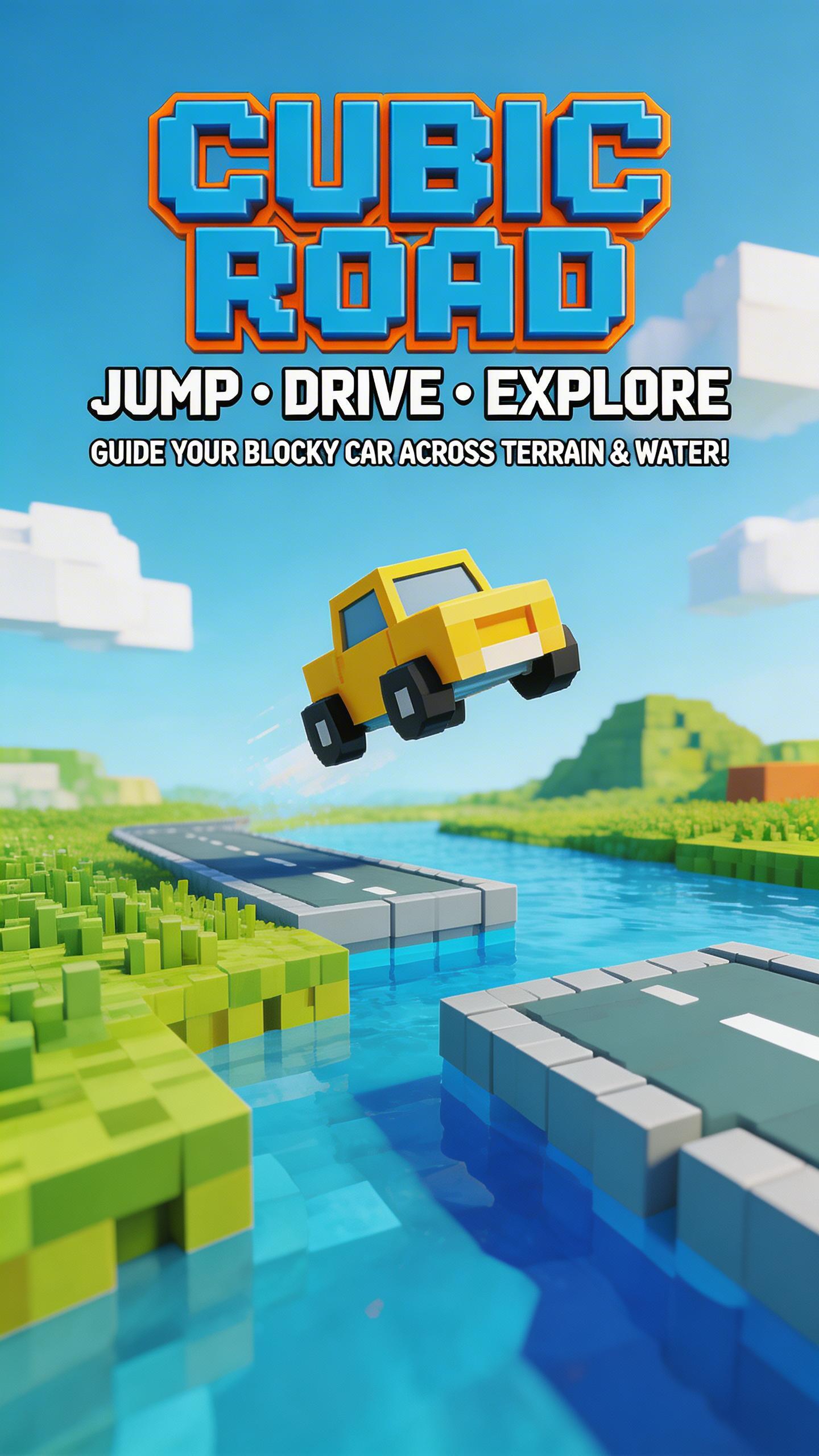 Guide a small blocky car forward across grass, roads, and water while jumping and avoiding hazards. Main elements are a yellow car with a red top, moving trucks, water platforms, diamonds, and splash/explosion effects...