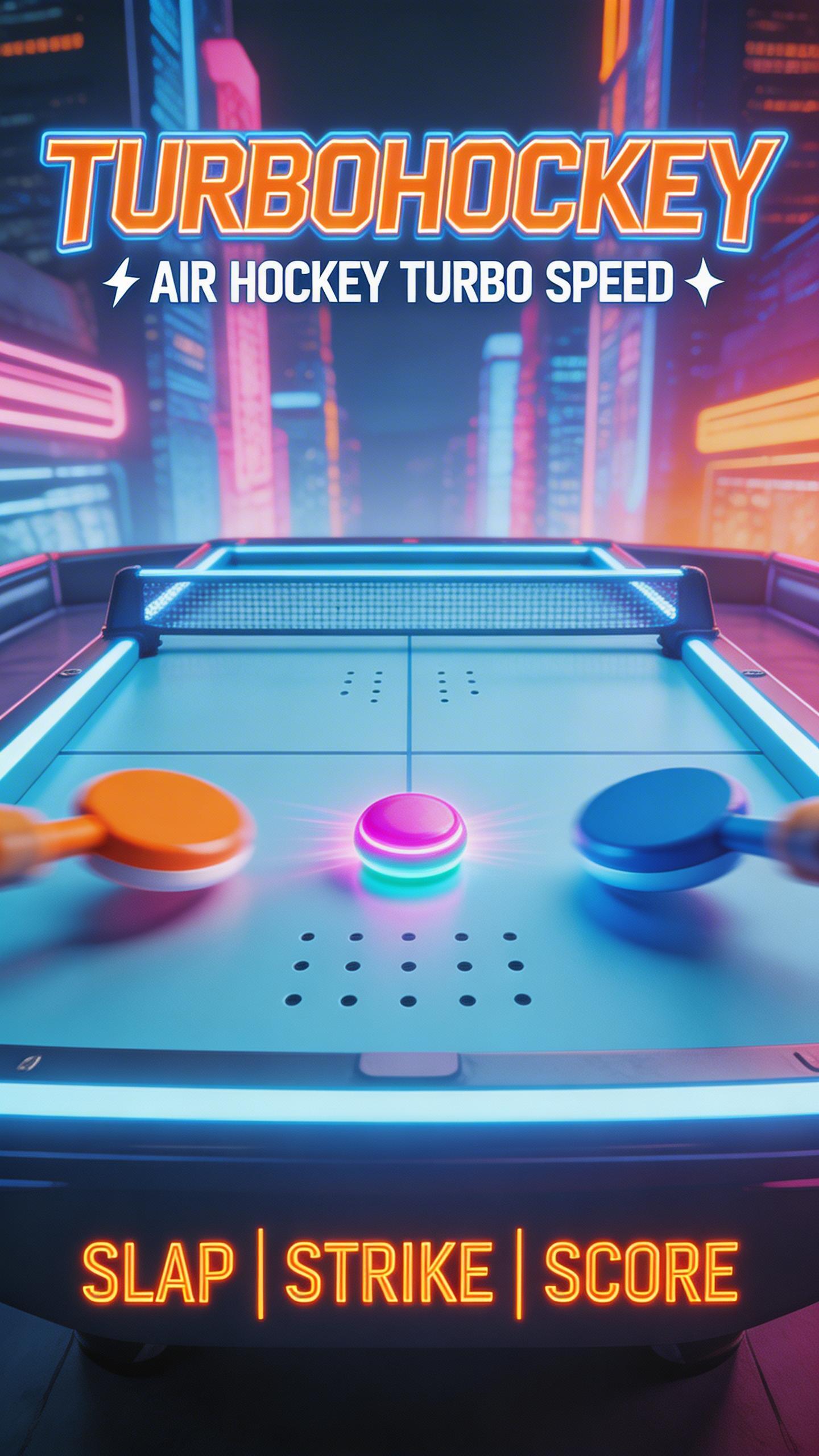 TurboHockey is a tabletop air-hockey style game where you control a mallet to strike a puck against a CPU opponent. The main elements are the rink, two goals, a puck, and two mallets; no emojis are used.