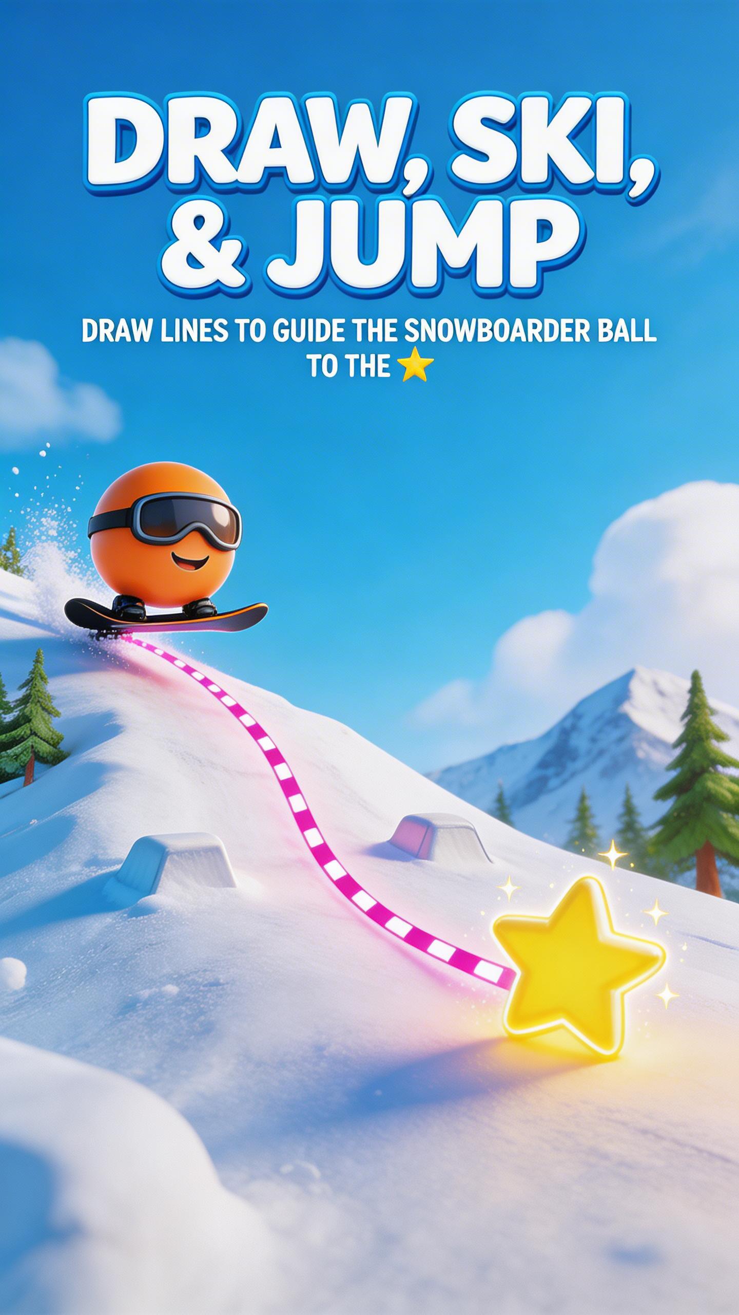 Draw lines to guide a snowboarder ball to a shining star (⭐). Main elements are a snowboarder image, a star goal (⭐), drawn lines, orange rectangular blocks (🟧), and heart emojis (❤️) for lives.
