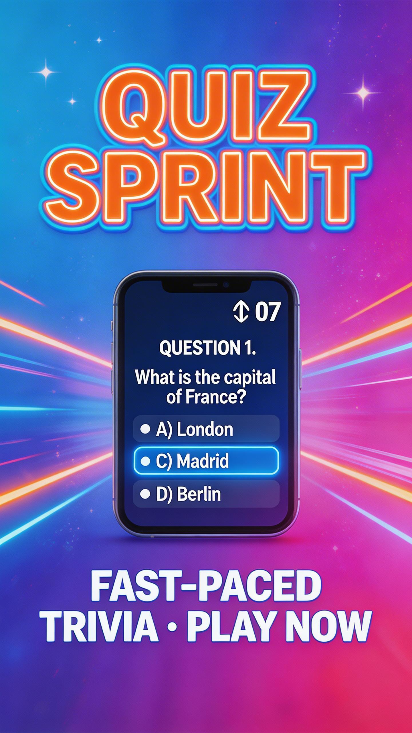 Quiz Sprint is a fast mobile trivia game where questions appear one at a time and you tap one of four answers.