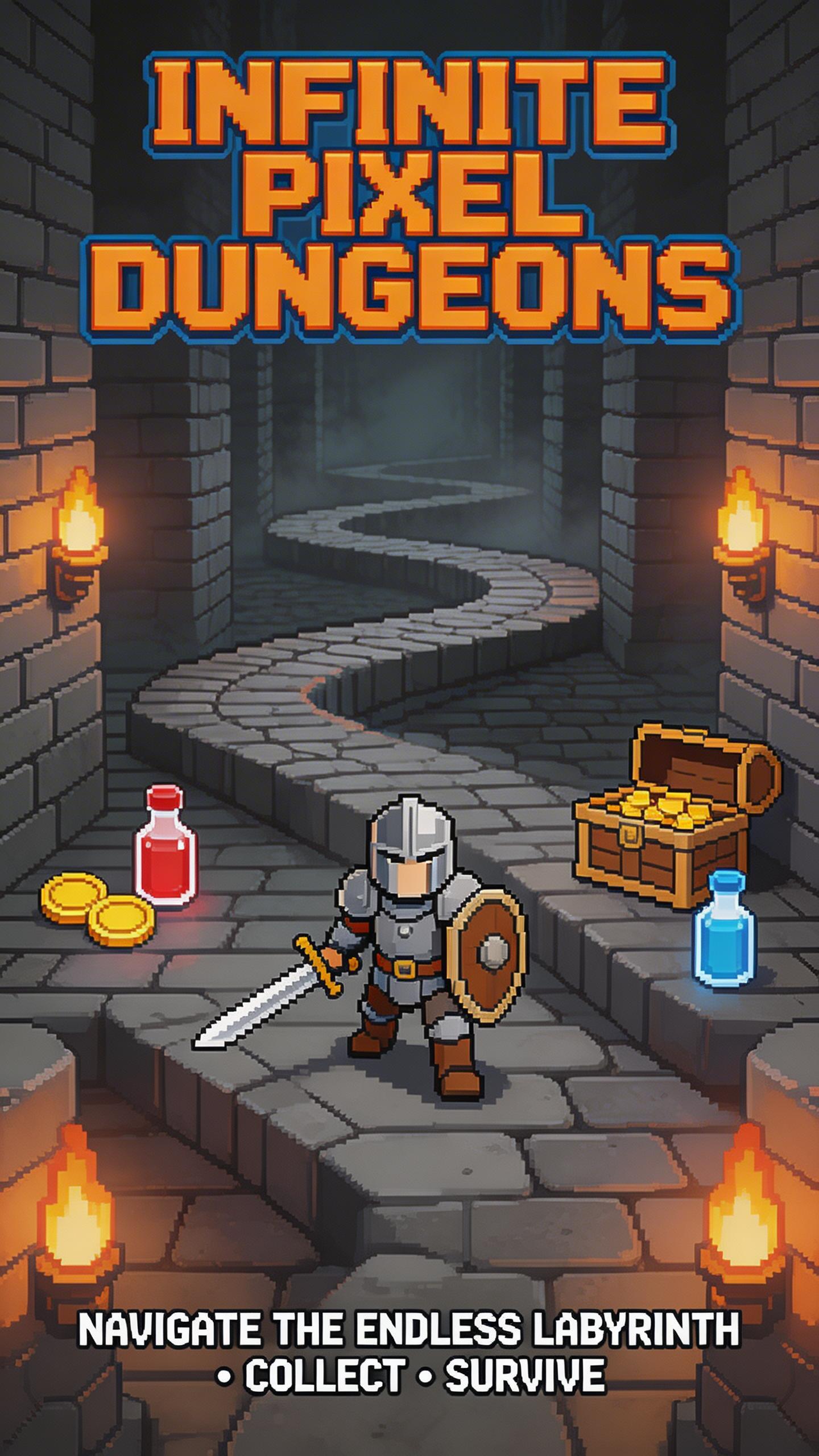 Infinite Pixel Dungeons is a retro pixelart maze game about navigating a twisting labyrinth, collecting dots, and dodging more pacmans as the levels rise.