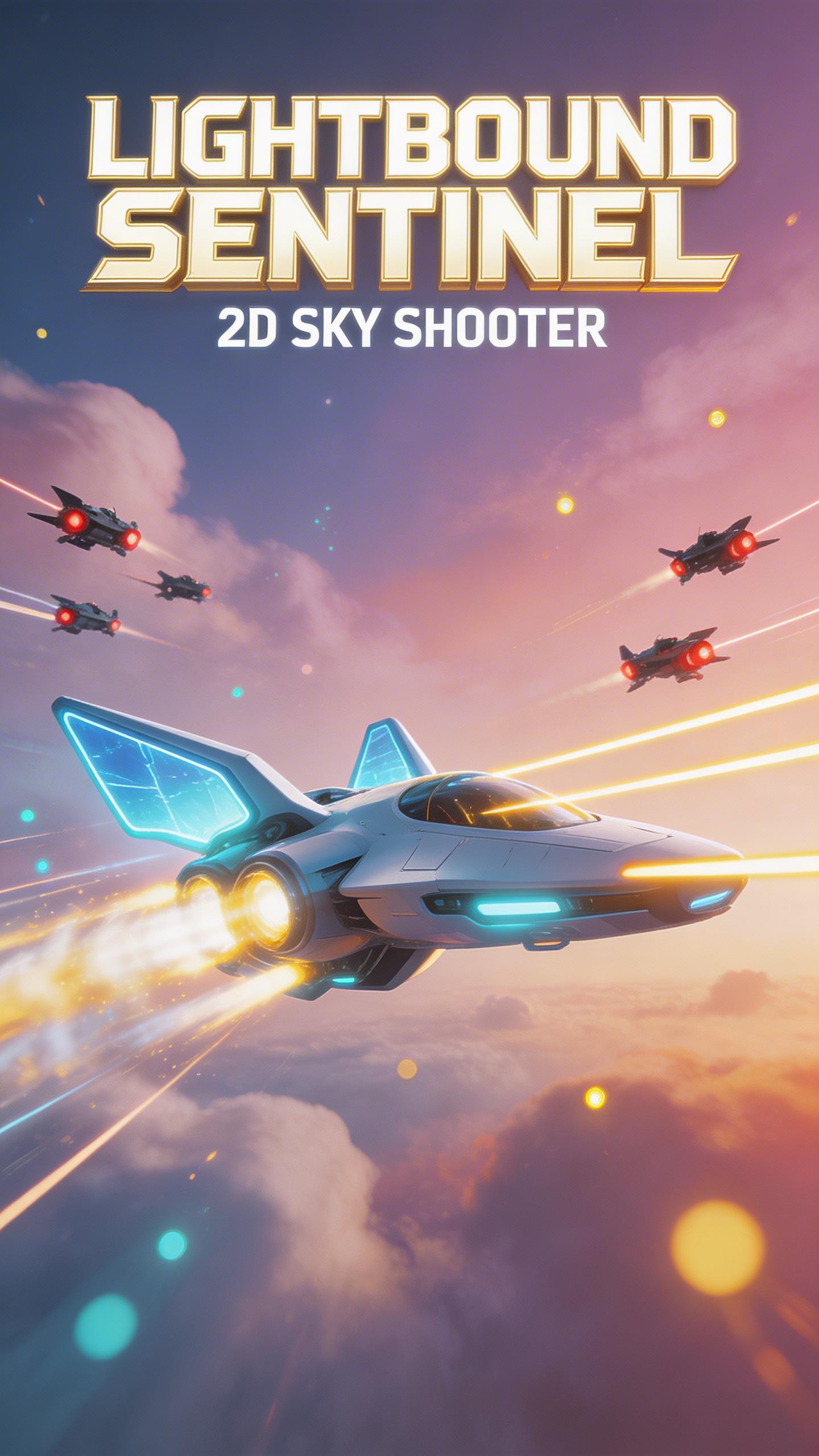 Lightbound Sentinel is a 2D sky shooter where you steer a glowing guardian with a virtual joystick and blast incoming shadow creatures.