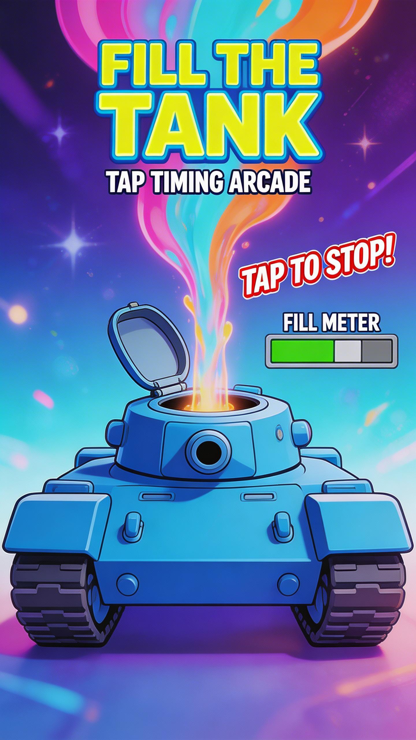 Fill the Tank is a tap-timing arcade game where you stop a falling stream of pastel balls to fill a tall vertical container as close as possible to a glowing dashed target line.